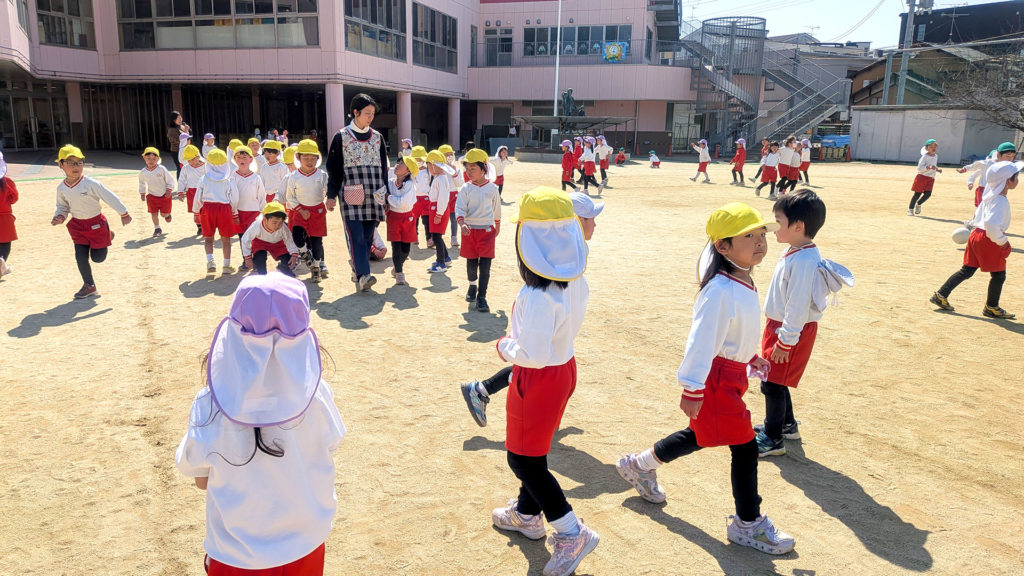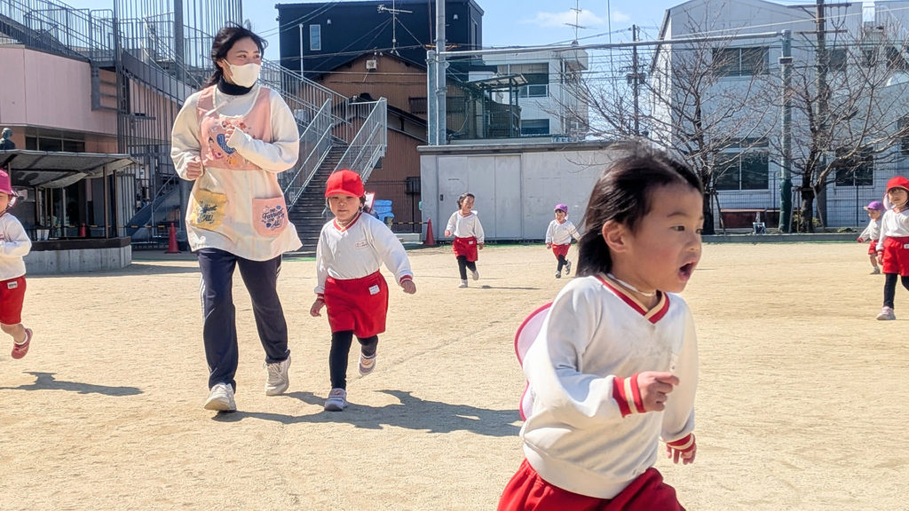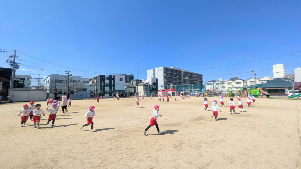 3月の御幣島幼稚園では、広い園庭を活かしたマラソン活動が行われています。まだ少し肌寒さの残る季節ですが、園庭には子どもたちの元気な声と軽やかな足音が広がります。
