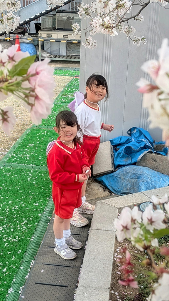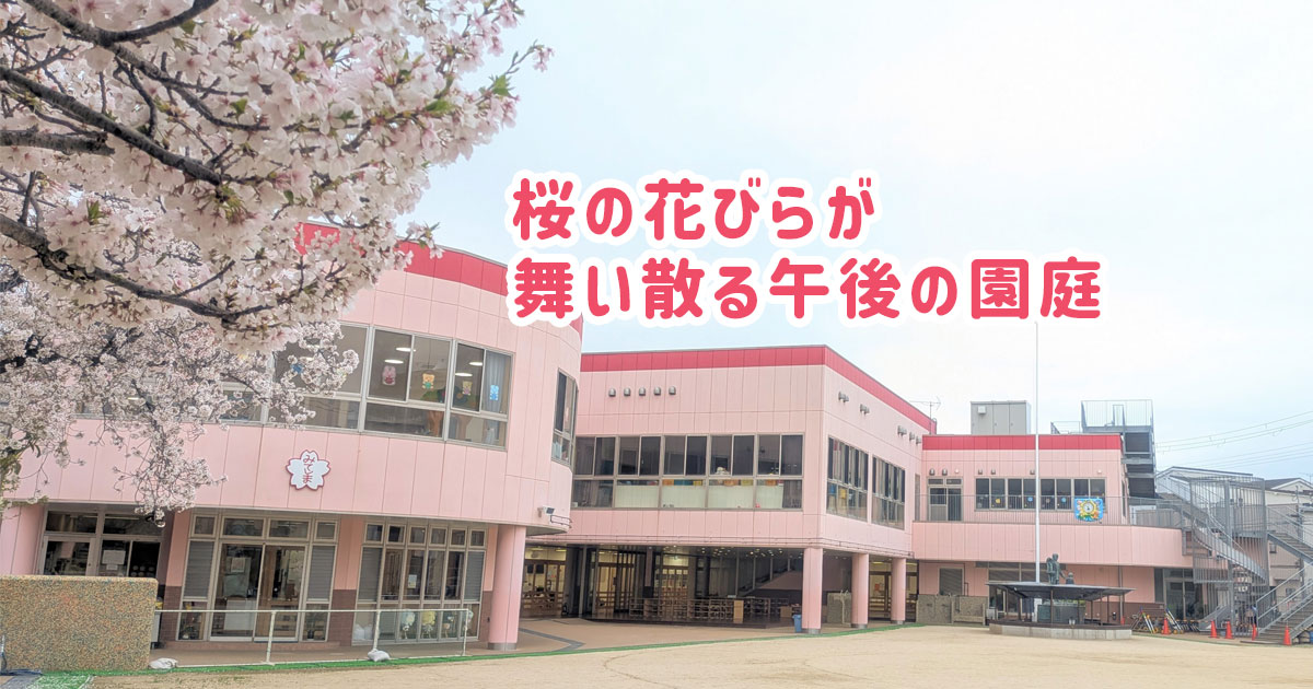 風がそっと吹くたびに、淡い花びらがふわりと舞い、園庭全体がまるで一枚の絵のような美しさに包まれています。