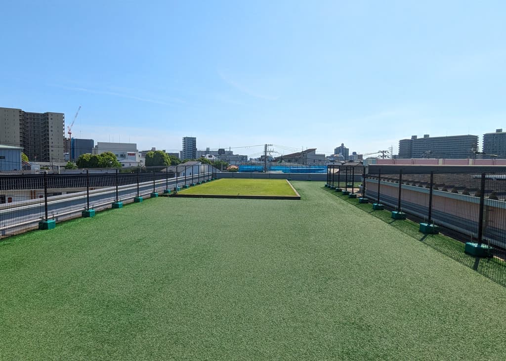 御幣島幼稚園の園庭は、大阪府内屈指の面積があり、日常の保育でも、先生のアイデア次第でどのようにでも活用したりイベントを開催する広さがありますが、同じく、幼稚園の園舎の屋上には、園舎とほぼ同じ大きさの人工芝の園庭があります。