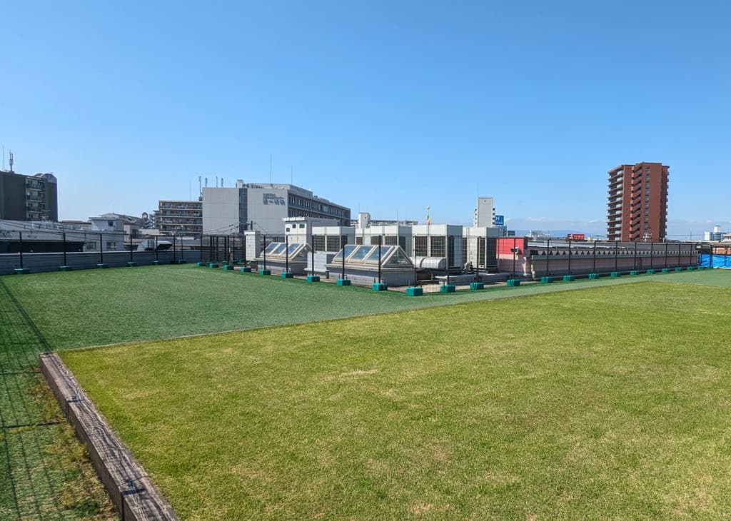 御幣島幼稚園の園庭は、大阪府内屈指の面積があり、日常の保育でも、先生のアイデア次第でどのようにでも活用したりイベントを開催する広さがありますが、同じく、幼稚園の園舎の屋上には、園舎とほぼ同じ大きさの人工芝の園庭があります。